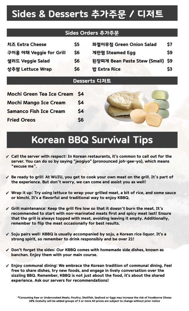 Introducing the menu at WuJu Korean BBQ, a Korean barbecue joint in Lynnwood, WA. Known for their WUJU Combo Deals and Korean Delights, the restaurant offers a wide range of options for all preferences. From the Beef Brisket Bento to the traditional Beef Short Rib Soup Galbi Tang, each dish is crafted with care and flavor. Customers rave about the attentive service and generous portions, making it a must-visit spot for Korean cuisine lovers. The welcoming atmosphere and delicious banchan add to the overall dining experience, leaving guests satisfied and eager to return for more. Be sure to try their LA Galbi, stone pot bibimbap, or the special combo for a taste of authentic Korean flavors. With a variety of amenities like private dining and drive-thru options, WuJu Korean BBQ provides a memorable dining experience for all.